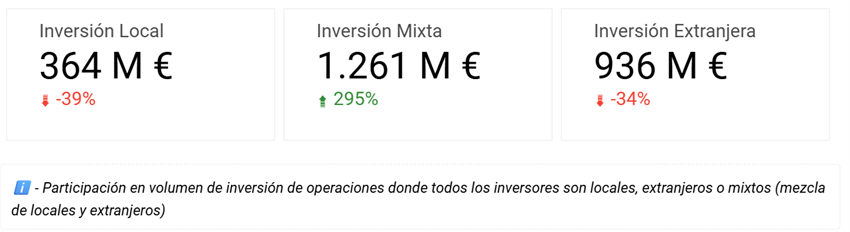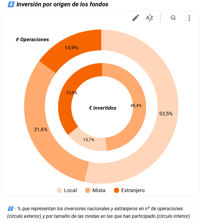 También resulta muy relevante, que el número de rondas en las que participan exclusivamente inversores locales representa la mayoría de las operaciones, con un 54% del total. Sin embargo, suponen movilizaron el 16% del importe total. Esta situación se debe a que las rondas financiadas exclusivamente por inversores locales tienden a ser en fases más iniciales, con importes menores.