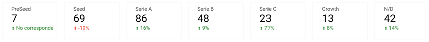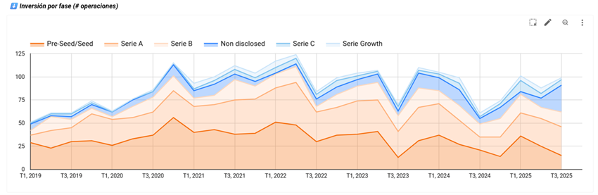 - Las rondas Serie A concentran el mayor número de operaciones (69). En cuanto al crecimiento interanual, aumentan considerablemente las Series C, lo que refleja un creciente interés por startups más maduras.