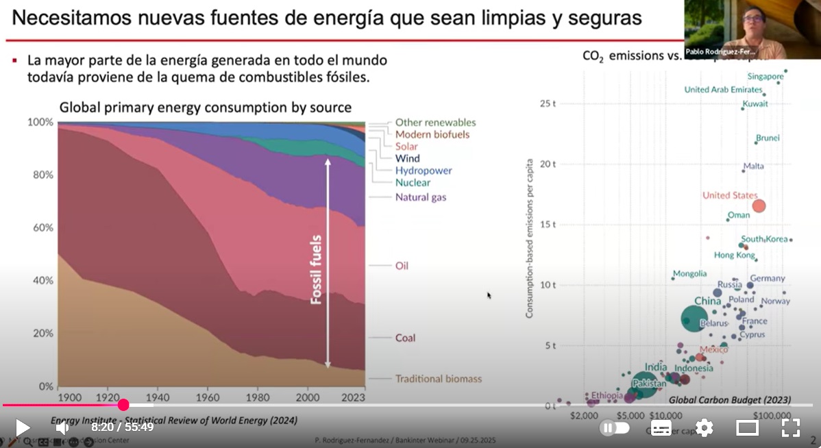 Pablo Rodríguez-Fernández abre su intervención recordando el motivo por el cual investigar en fusión nuclear es relevante hoy. Más del 80 % de la energía primaria mundial sigue dependiendo de combustibles fósiles. Esta situación genera un volumen elevado de emisiones de CO₂, directamente correlacionadas con el desarrollo económico y el aumento del consumo energético.