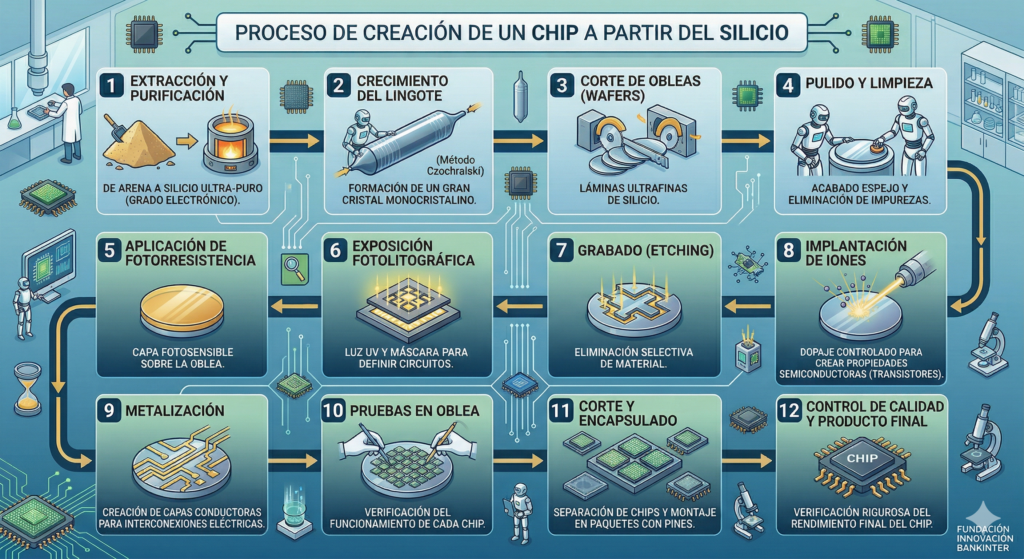 Es crucial diferenciar entre la fabricación de la oblea (el sustrato vacío) y la fabricación del chip (el circuito). El material descrito hasta aquí es la oblea «virgen».